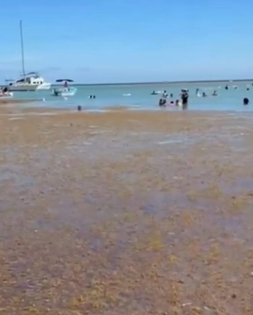 Pese a la abundante acumulación de sargazo que tiñe las aguas de un tono marrón, cientos de visitantes se dieron cita en la playa de Boca Chica para disfrutar del ambiente costero.