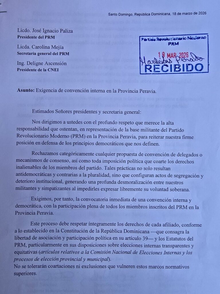 Un grupo de dirigentes y autoridades del Partido Revolucionario Moderno (PRM) en la provincia Peravia ha elevado una comunicación formal en la que exige la realización de una convención interna con voto universal, marcando una posición firme frente a propuestas de consenso dentro de la organización.