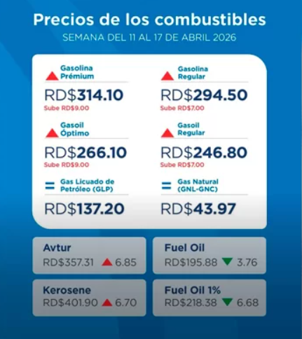 El Ministerio de Industria, Comercio y MiPymes anunció que para la semana del 11 al 17 de abril, el precio del Gas Licuado de Petróleo (GLP) se mantendrá sin variación. No obstante, las gasolinas y el gasoil experimentarán alzas que oscilan entre los RD$7.00 y RD$9.00 por galón.