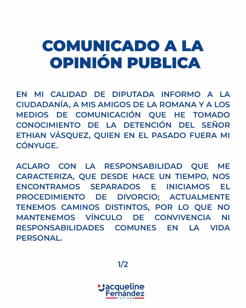 La diputada por la provincia La Romana emitió un comunicado oficial dirigido a la opinión pública, aclarando que desde hace un tiempo se encuentra separada de Ethian Vásquez, actualmente detenido y bajo investigación por las…